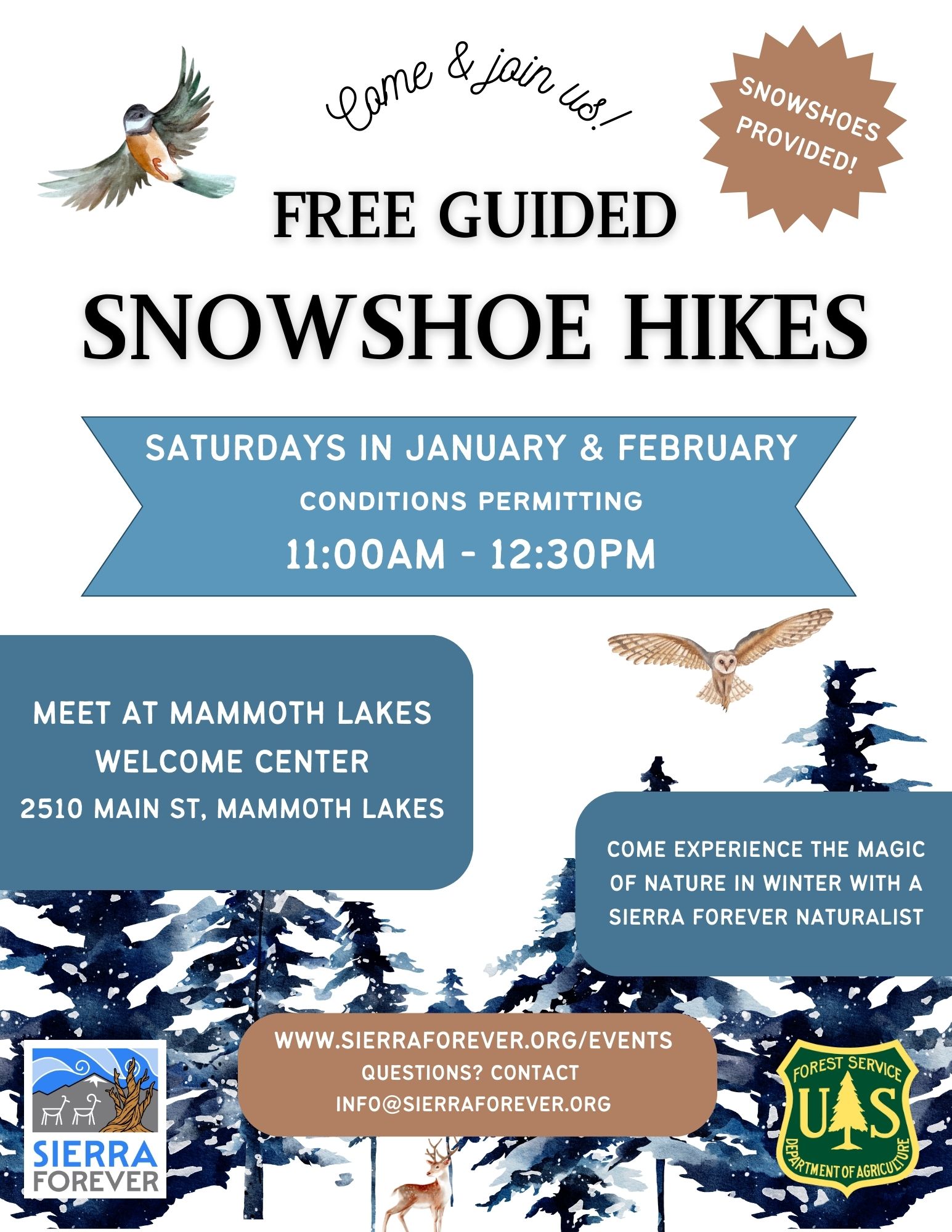 Join Sierra Forever every Saturday in February for a fun, informative and FREE snowshoe hike through the snowy forest around Mammoth Lakes Welcome Center. Guided by a naturalist who will point out things along the way, you will go on a 1.75-mile hike through the Jeffrey pine forest along a mostly flat trail. Whether you're new to snowshoeing or a seasoned pro, this is the perfect way to connect with nature this winter!