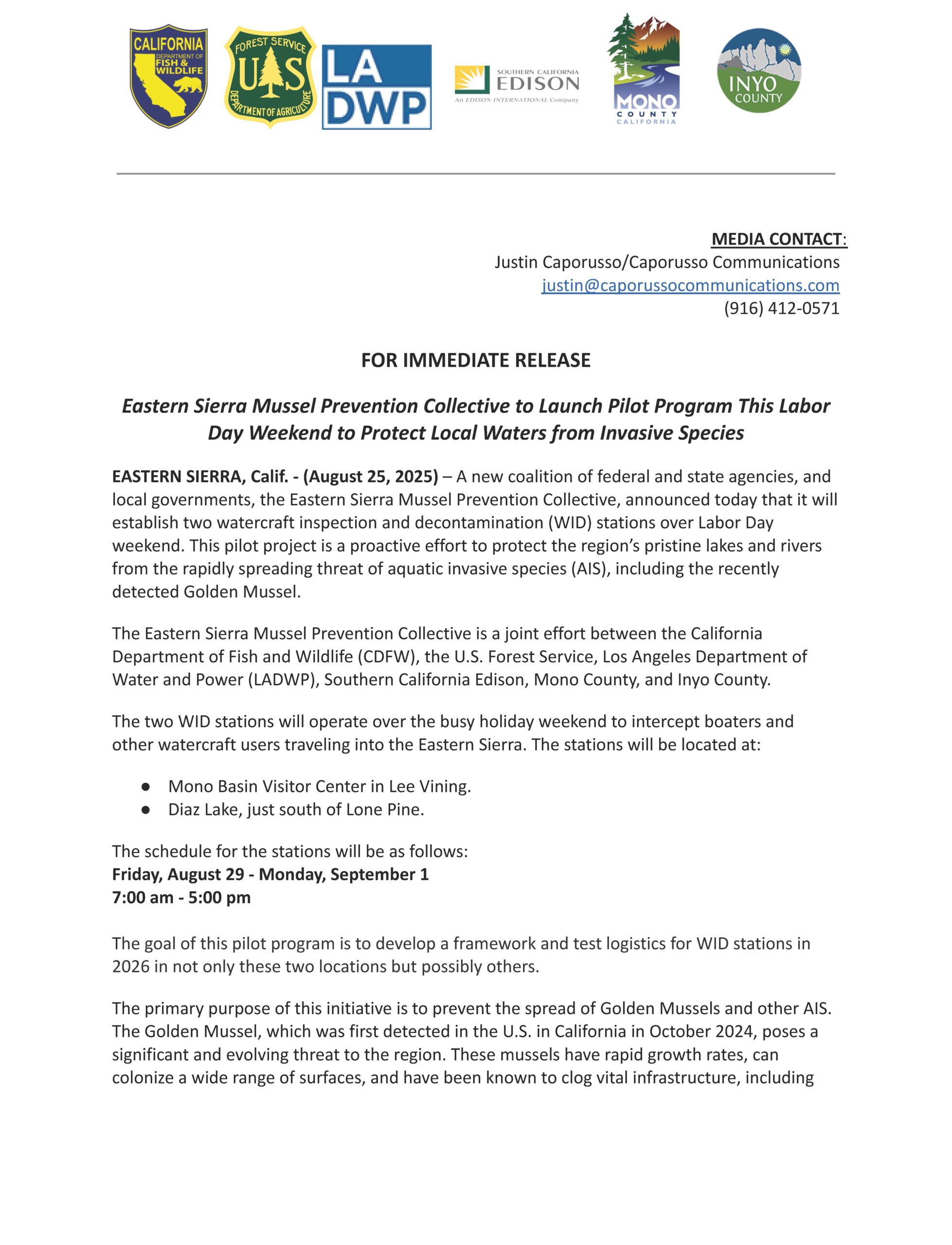 EASTERN SIERRA, Calif. - (August 25, 2025) – A new coalition of federal and state agencies, and local governments, the Eastern Sierra Mussel Prevention Collective, announced today that it will establish two watercraft inspection and decontamination (WID) stations over Labor Day weekend. This pilot project is a proactive effort to protect the region’s pristine lakes and rivers from the rapidly spreading threat of aquatic invasive species (AIS), including the recently detected Golden Mussel.