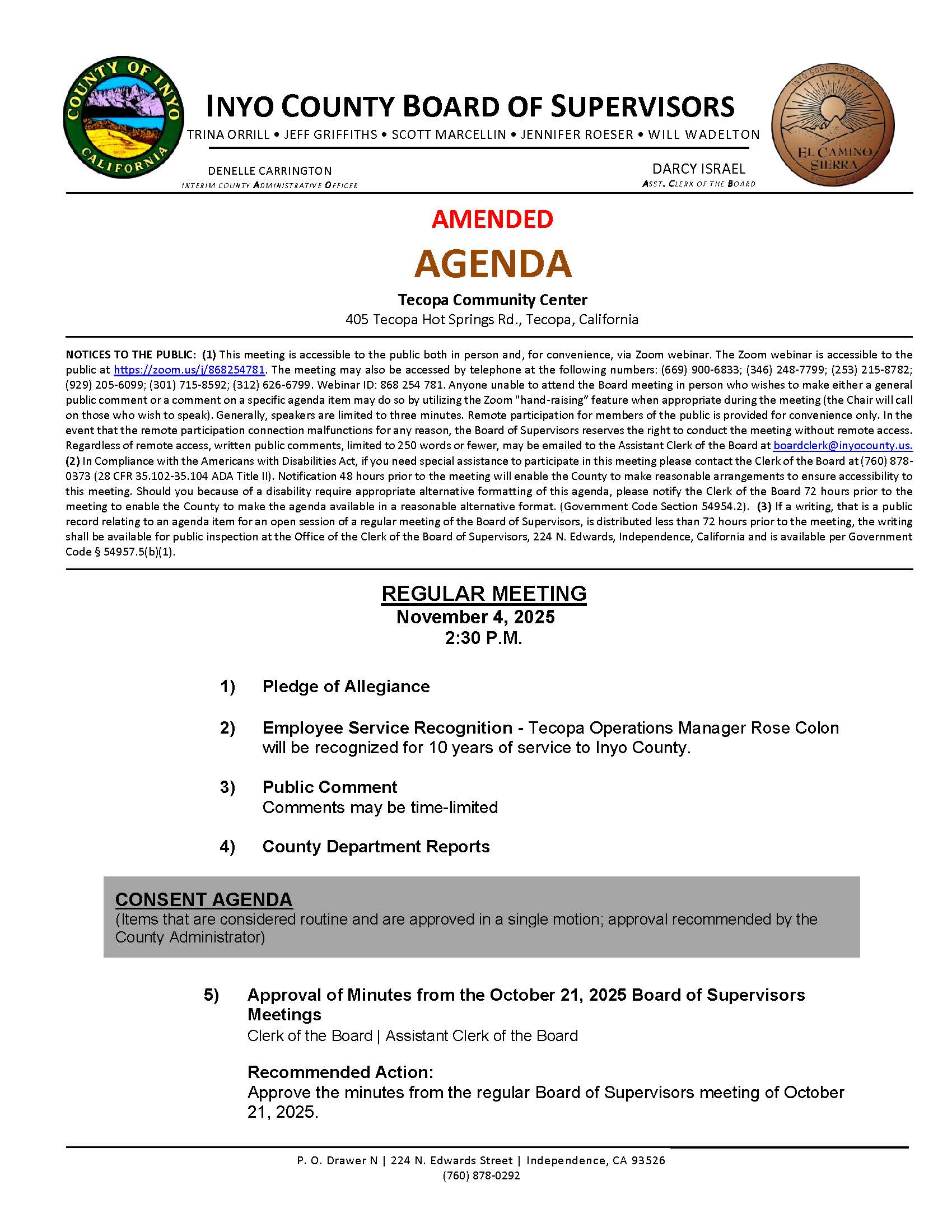Inyo County Board of Supervisors Regular Meetin November 4th in Tecopa Amended Agenda