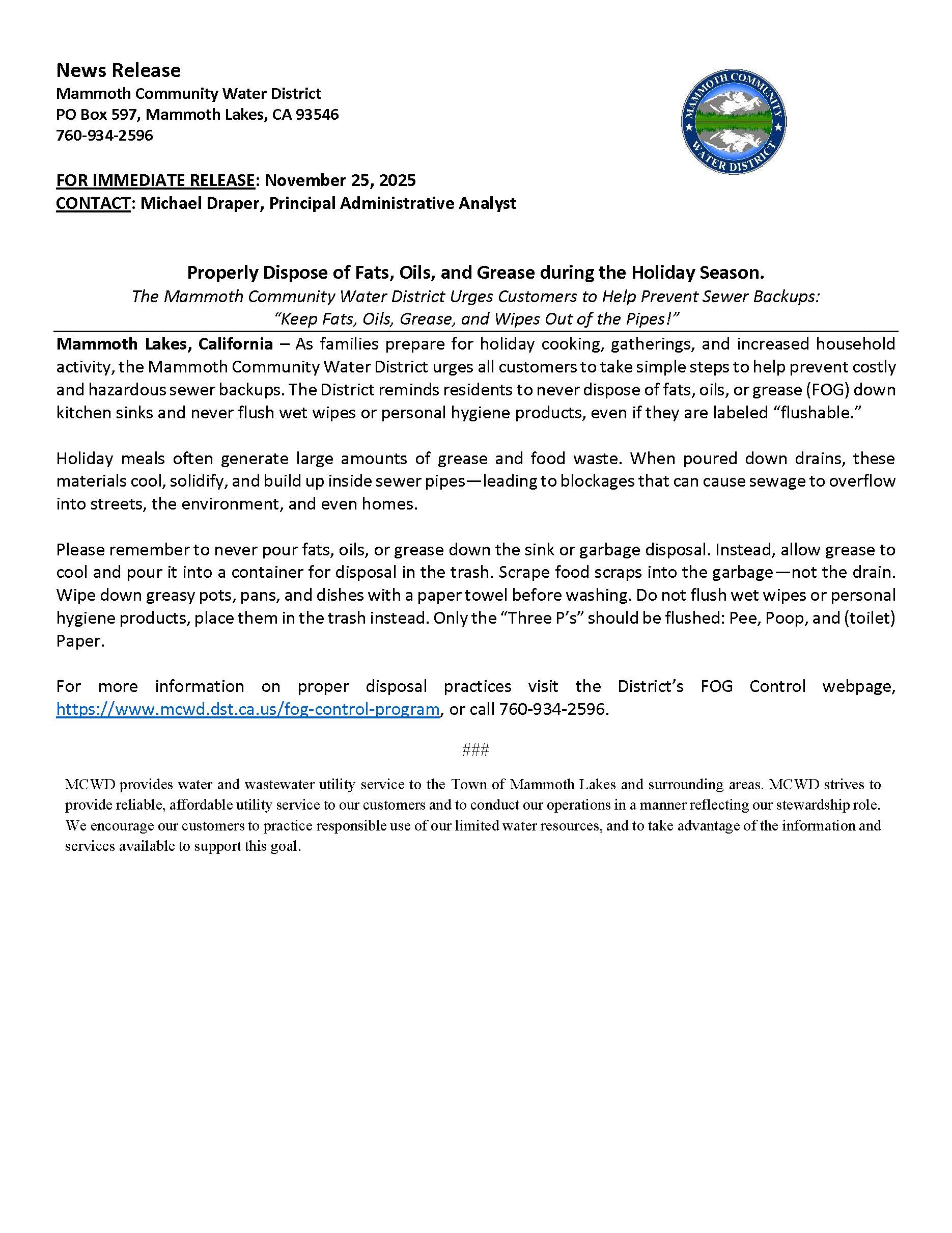 Mammoth Lakes, California – As families prepare for holiday cooking, gatherings, and increased household activity, the Mammoth Community Water District urges all customers to take simple steps to help prevent costly and hazardous sewer backups. The District reminds residents to never dispose of fats, oils, or grease (FOG) down kitchen sinks and never flush wet wipes or personal hygiene products, even if they are labeled “flushable.”