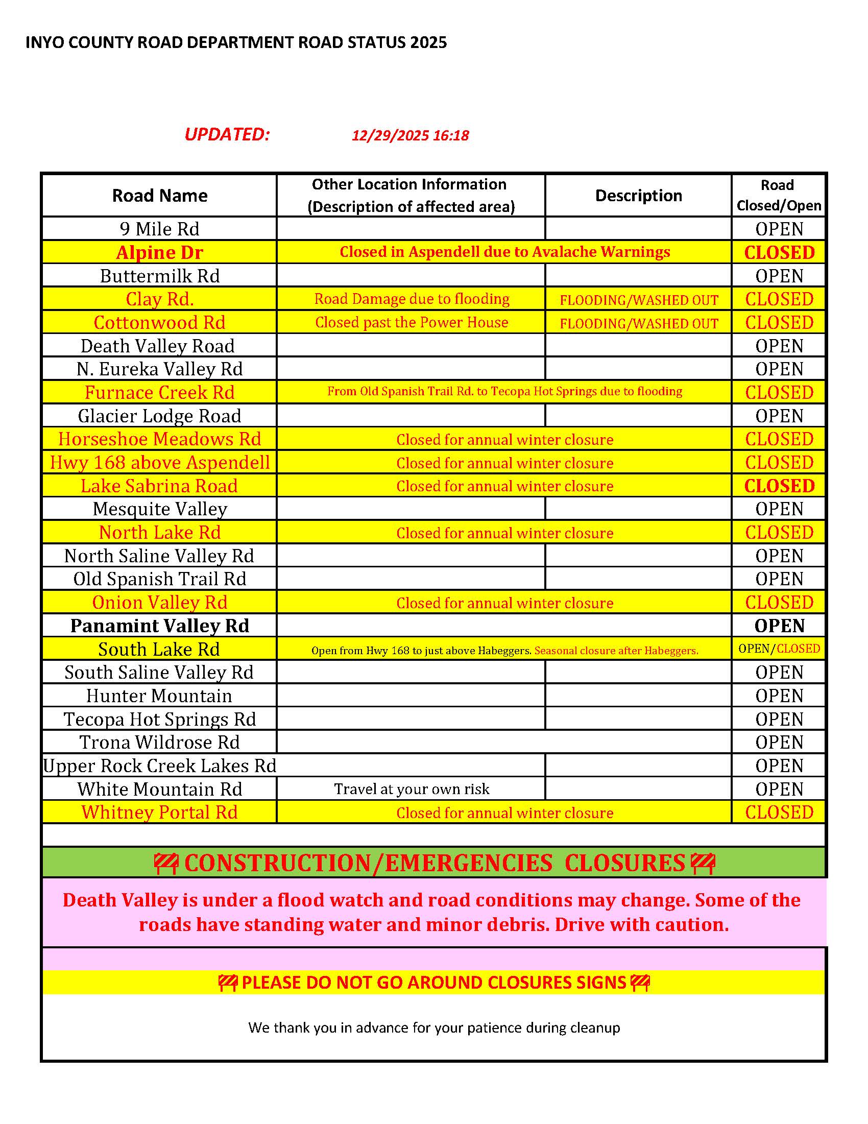 Furnace Creek Rd.– CLOSED Closed from Old Spanish Tail Rd. to Tecopa Hot Springs due to flooding. For your safety, please be cautious of road crews during this muddy clean up.