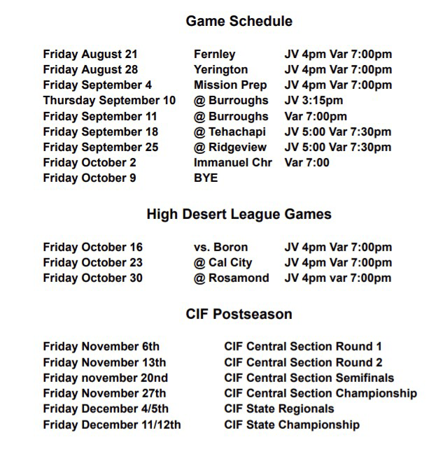 Friday August 21 Fernley JV 4pm Var 7:00pm Friday August 28 Yerington JV 4pm Var 7:00pm Friday September 4 Mission Prep JV 4pm Var 7:00pm Thursday September 10 @ Burroughs JV 3:15pm Friday September 11 @ Burroughs Var 7:00pm Friday September 18 @ Tehachapi JV 5:00 Var 7:30pm Friday September 25 @ Ridgeview JV 5:00 Var 7:30pm Friday October 2 Immanuel Chr Var 7:00 Friday October 9 BYE