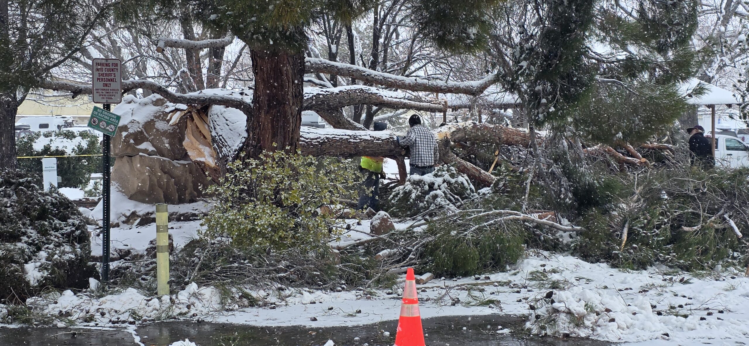 Public works teams arrived early to assess damage and start cutting and hauling debris from the site. The downed tree, which came down during recent weather, blocked part of the park area behind the building. https://sierrawave.net/city-of-bishop-tree-split-and-removal-has-begun/