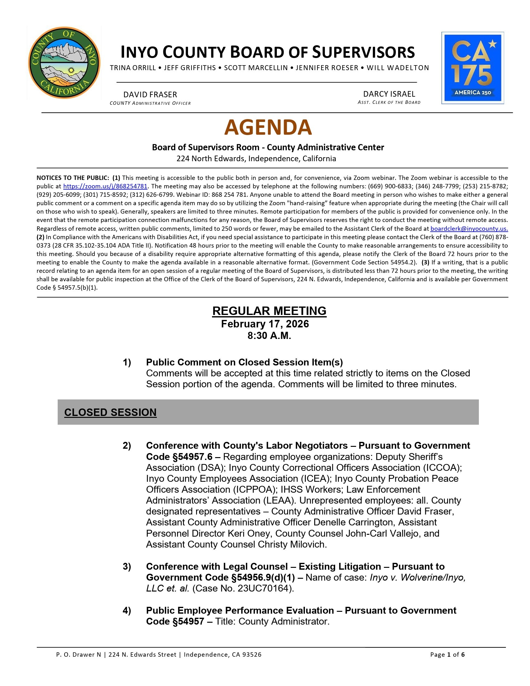 Inyo County Board of Supervisors Regular Meeting Agenda February 17th