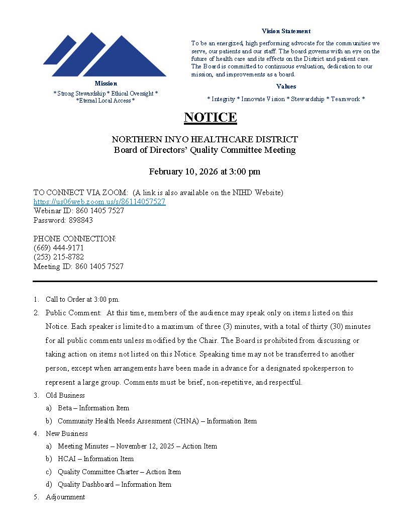 NORTHERN INYO HEALTHCARE DISTRICT Board of Directors’ Quality Committee Meeting