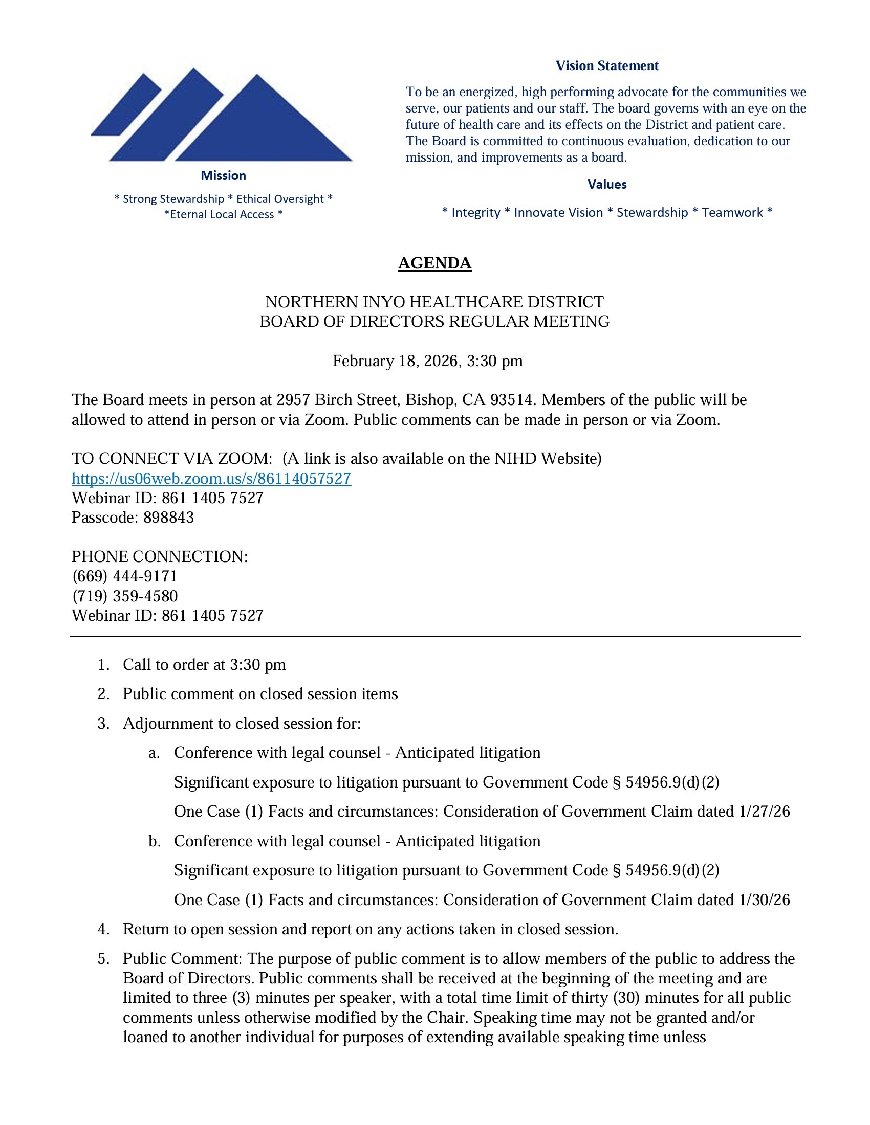 The Board meets in person at 2957 Birch Street, Bishop, CA 93514. Members of the public will be allowed to attend in person or via Zoom. Public comments can be made in person or via Zoom. TO CONNECT VIA ZOOM: (A link is also available on the NIHD Website) https://us06web.zoom.us/s/86114057527 Webinar ID: 861 1405 7527 Passcode: 898843 PHONE CONNECTION: (669) 444-9171 (719) 359-4580 Webinar ID: 861 1405 7527 https://sierrawave.net/nihd-regular-meeting-february-18th/