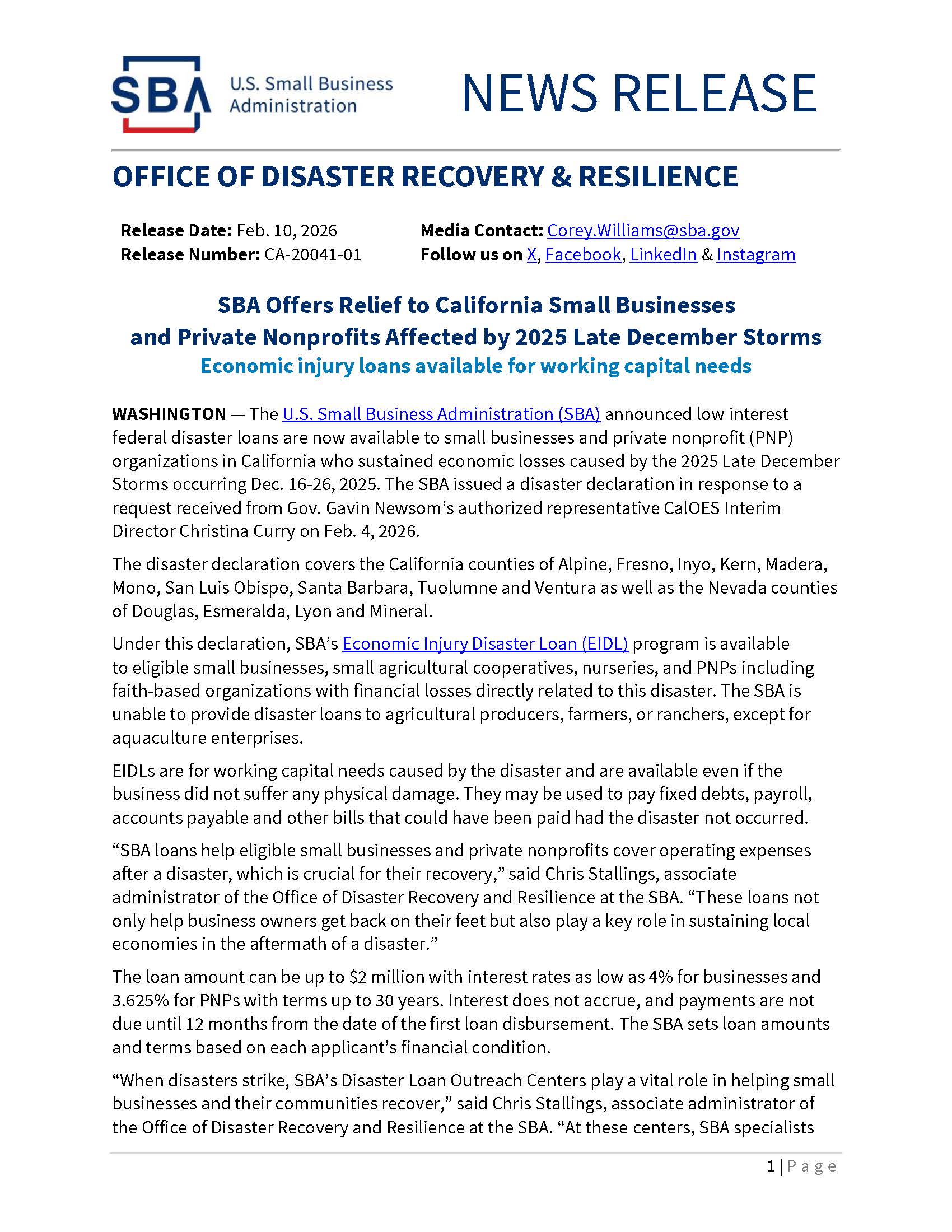 WASHINGTON — The U.S. Small Business Administration (SBA) announced low interest federal disaster loans are now available to small businesses and private nonprofit (PNP) organizations in California who sustained economic losses caused by the 2025 Late December Storms occurring Dec. 16-26, 2025. The SBA issued a disaster declaration in response to a request received from Gov. Gavin Newsom’s authorized representative CalOES Interim Director Christina Curry on Feb. 4, 2026.