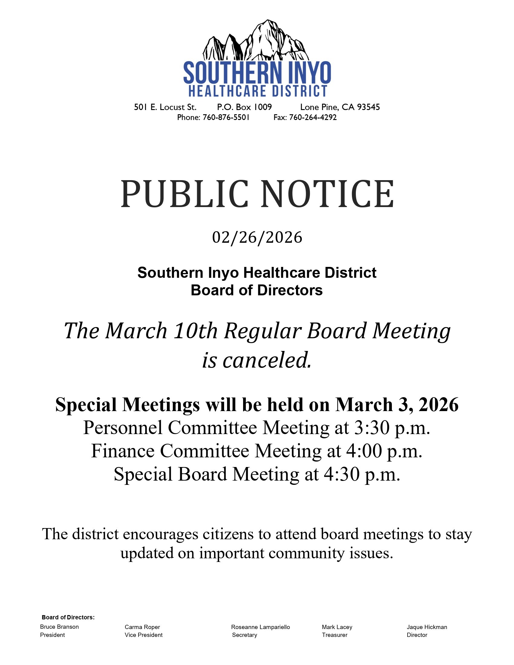 The Southern Inyo Healthcare District issued a public notice on February 26, 2026, regarding changes to their Board of Directors meeting schedule.