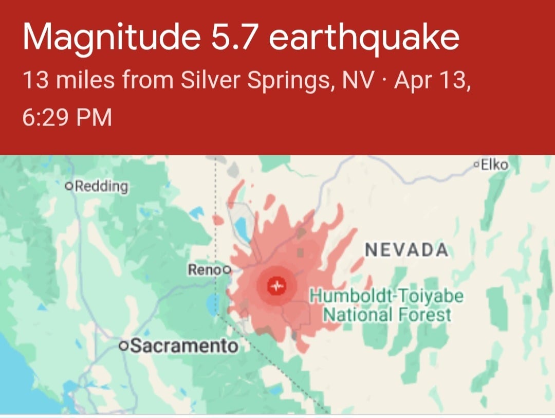 A magnitude 5.7 earthquake struck rural Nevada east of Carson City early this morning, April 14, 2026. Centered near Silver Springs, the temblor occurred at a shallow depth of 3.1 miles, causing light to moderate damage and sending items flying off shelves in nearby Fallon. While residents reported strong shaking for nearly a minute, no major injuries have been confirmed, though several aftershocks continue to rattle the region. https://sierrawave.net/earthquake-rattles-nevada-east-of-carson-city/