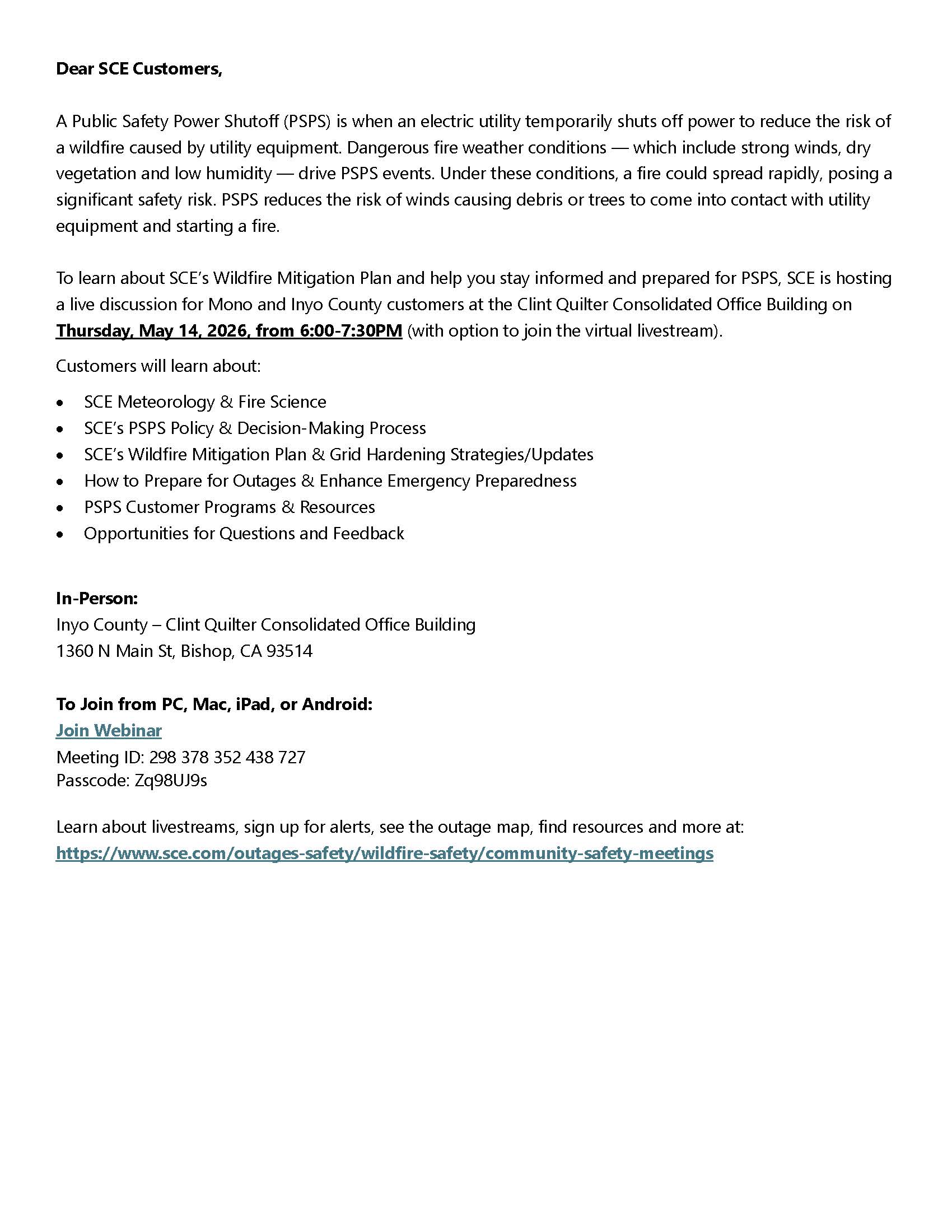 To learn about SCE’s Wildfire Mitigation Plan and help you stay informed and prepared for PSPS, SCE is hosting a live discussion for Mono and Inyo County customers at the Clint Quilter Consolidated Office Building on Thursday, May 14, 2026, from 6:00-7:30PM (with option to join the virtual livestream).