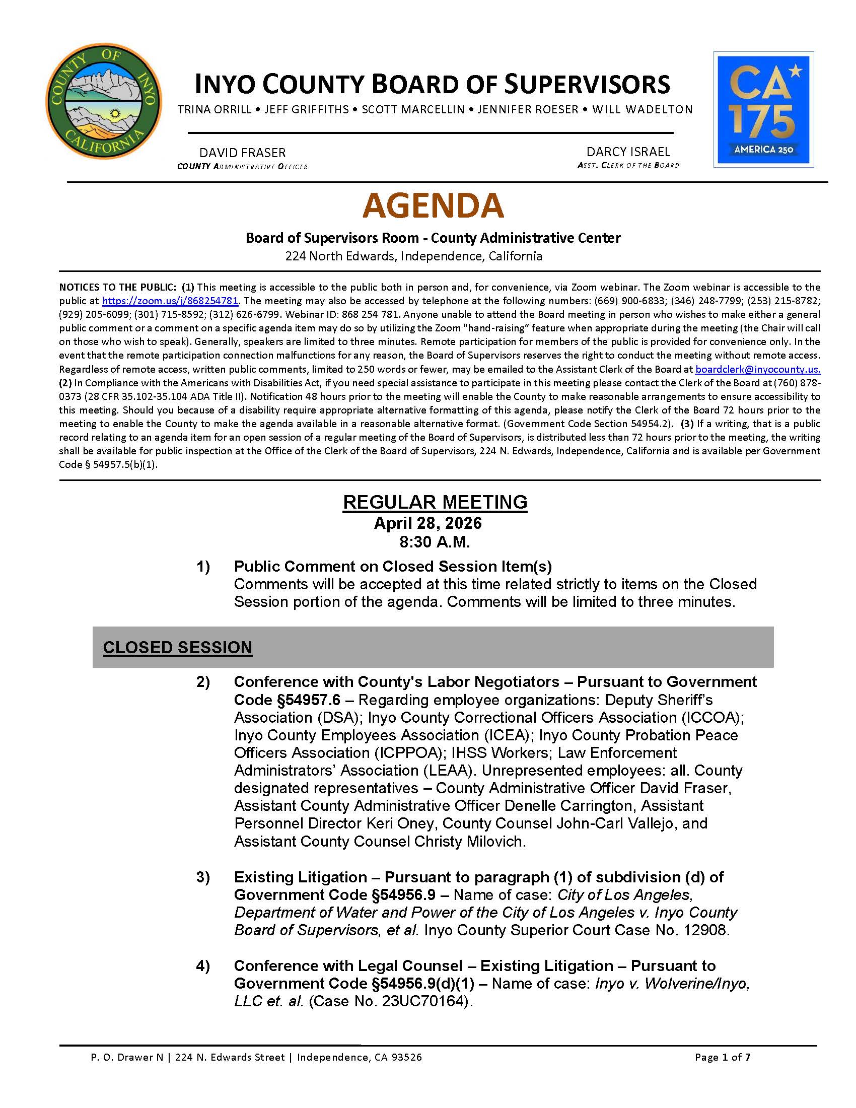 Remote participation for members of the public is provided for convenience only. In the event that the remote participation connection malfunctions for any reason, the Board of Supervisors reserves the right to conduct the meeting without remote access. Regardless of remote access, written public comments, limited to 250 words or fewer, may be emailed to the Assistant Clerk of the Board at boardclerk@inyocounty.us.