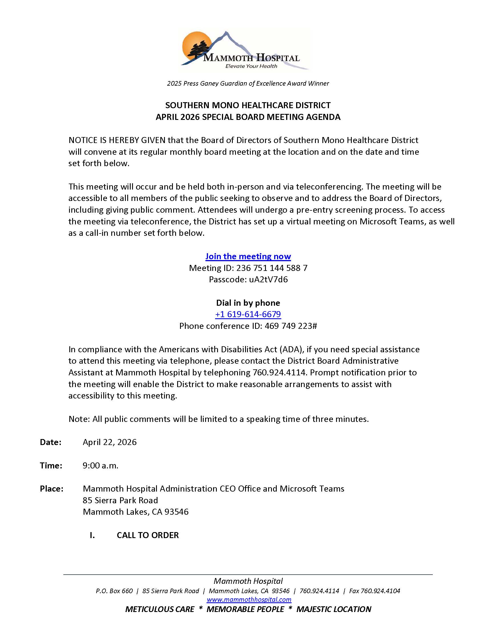 Place: Mammoth Hospital Administration CEO Office and Microsoft Teams